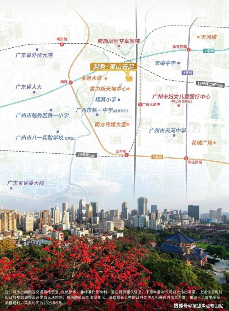 所以,全新新规项目越秀·東山云起的亮相,堪称“世纪联姻”——从地图上看,東山云起与天河一路之隔,集齐了广州政教文中心+城市中轴+珠江新城三大buff。