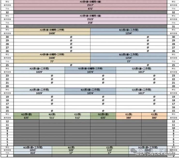 31楼: 2523呎+ 258呎平台* 4房3套32楼2517呎+ 470呎天台* 4房3套,内置