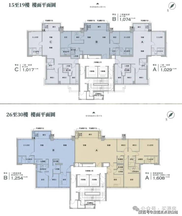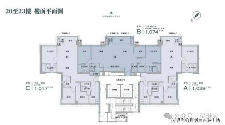 15楼-23楼: A :1029呎,B :1074呎,C :1017呎3房2套共27伙,可以打通相邻