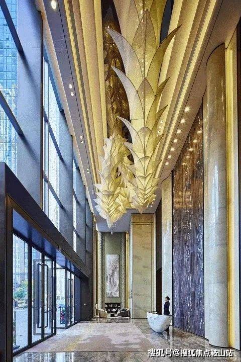 约10米挑高首层大堂。设计采用流水为元素,迈入大堂犹如置身于水波粼粼之中。门头的水波纹玻璃有着黄河之水天上来的恢弘之势。天花顶棚巧妙糅合镜面元素与自然的叶脉灯饰设计,体验从“水光之晶” 过渡到“自然森林”,自然而然。