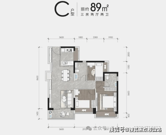 89㎡户型:传统的竖厅设计,动静分区明确,三房两厅一厨两卫一阳台的布局合理,虽然无明显亮点,但也没有明显的缺点。