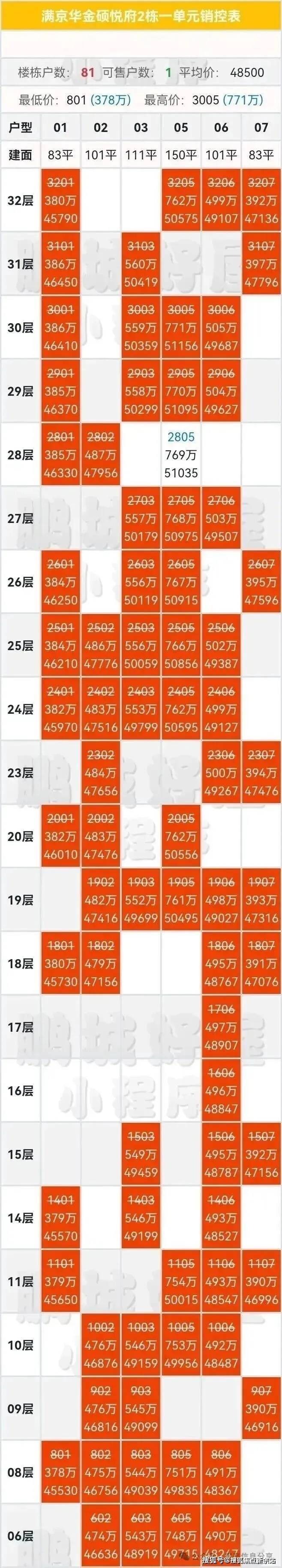 本次推售的是满京华金硕悦府,共由5栋32-48层高的住宅组成,其中1栋1/2单元住宅48F,2栋1单元住宅32F,2栋2单元住宅47F,3栋住宅48F,4栋是1所幼儿园,还配建有社区菜市场,总规划1186户,其中2栋1单元2梯6户,1栋1单元楼王3梯5户,其它栋数全部3梯6户设计。