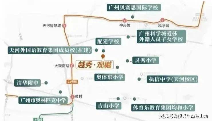 小学:配建 24 班小学,引进广州天河外国语教育集团合作办学,周边 3km 内有 15 个小学,包括奥体东小学、广州思源学校小学部等。