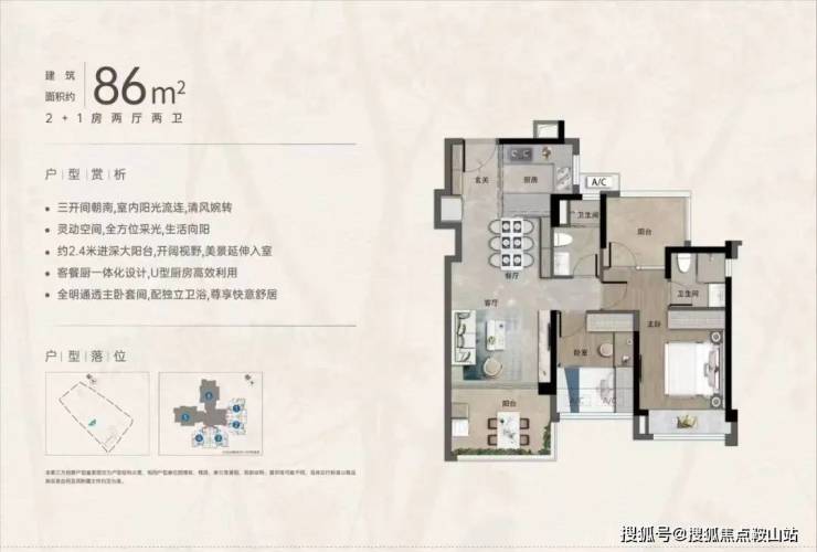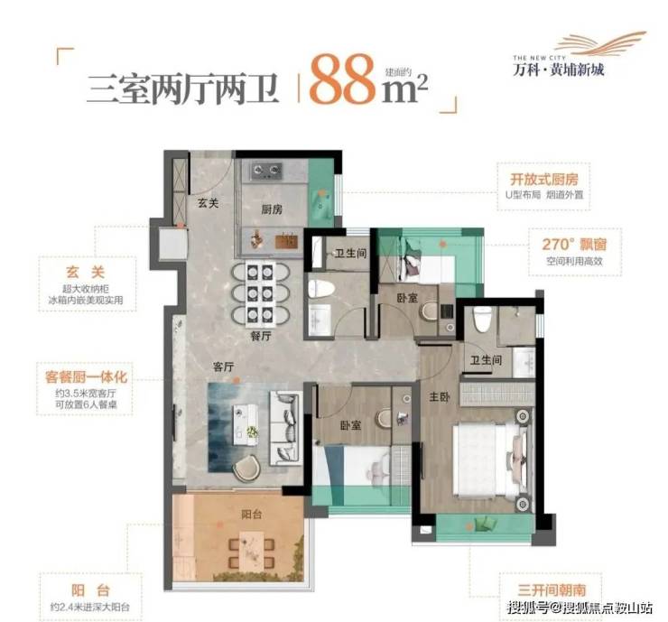 建面88平南向三房两卫,客厅LDK一体化设计,U型厨房,次卧270度飘窗设计