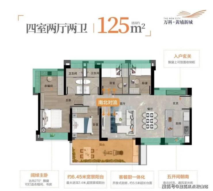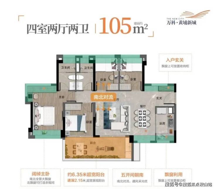 建面105平南向四房两卫,南北对流,五开间朝南,6.35米长阳台,横厅设计
