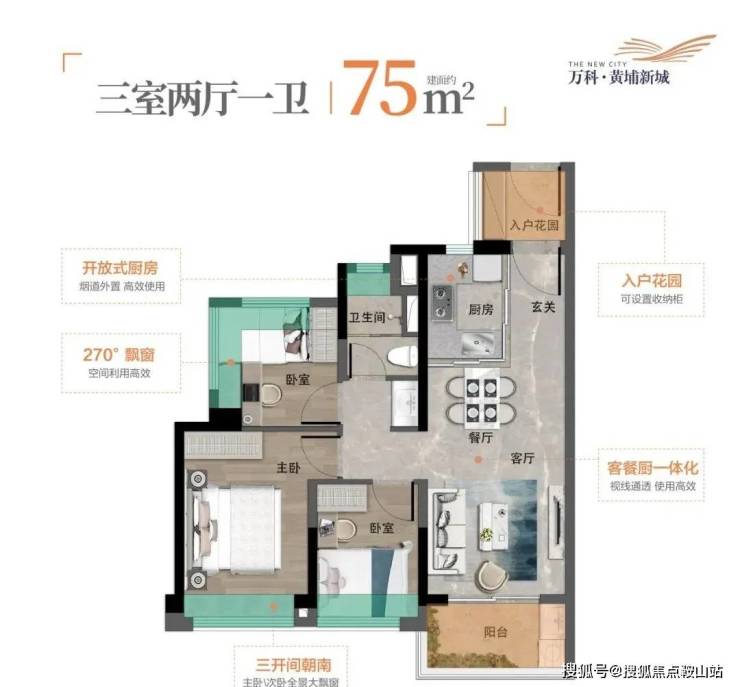 建面75平三房一卫,进门有入户花园,客厅LDK设计,客厅开间3.2米,南向三开间,主卧南向全景大飘窗,