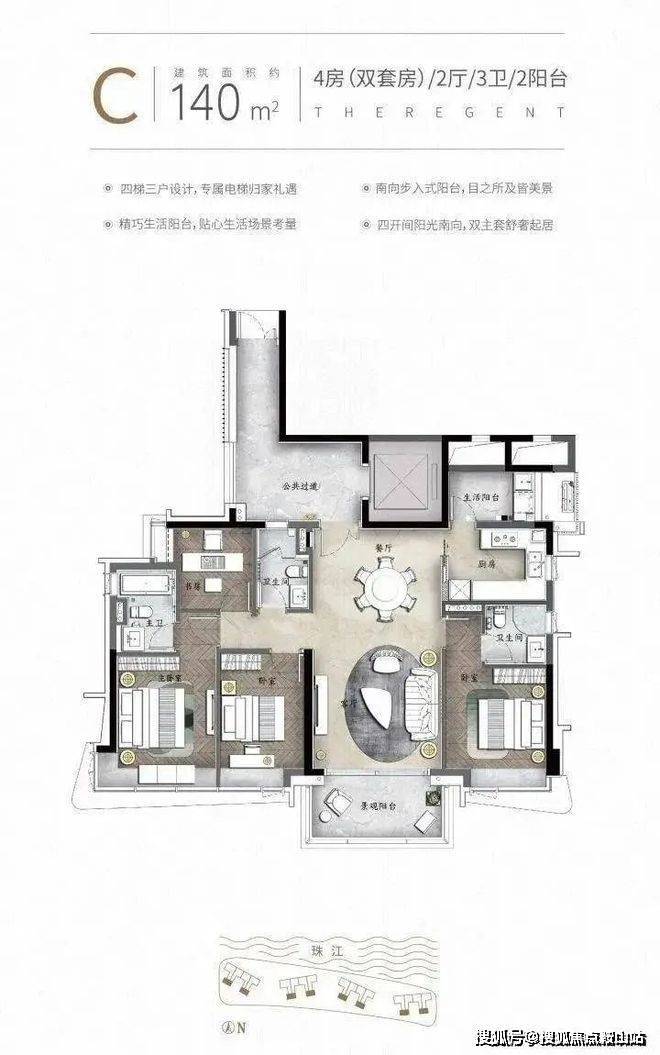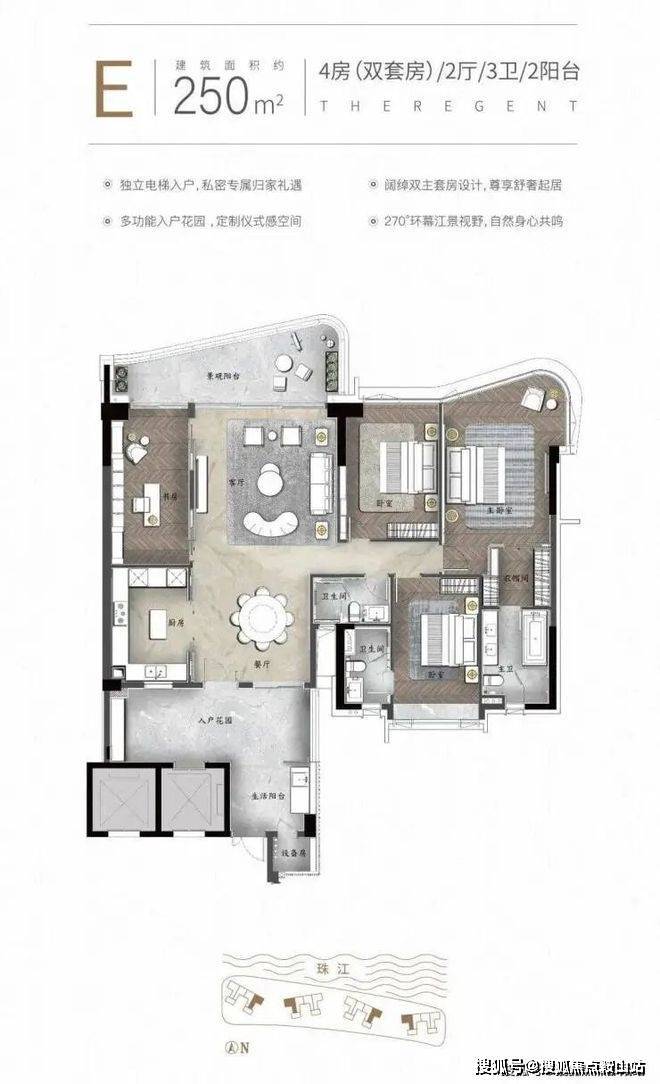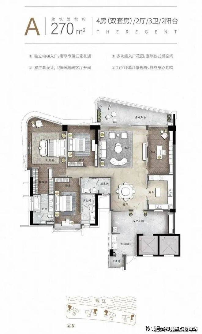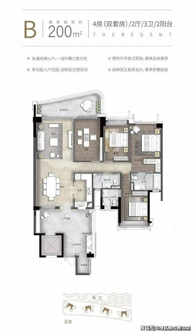 『天启』组团面积约为140-250平方米,户型涵盖多种选择,从一线环幕江景大宅到南向园景大宅,满足不同家庭的需求。所有户型均采用专梯专户四房双套房设计,配备12大国际一线品牌交标,确保每一寸空间都体现出极致的品质与奢华。