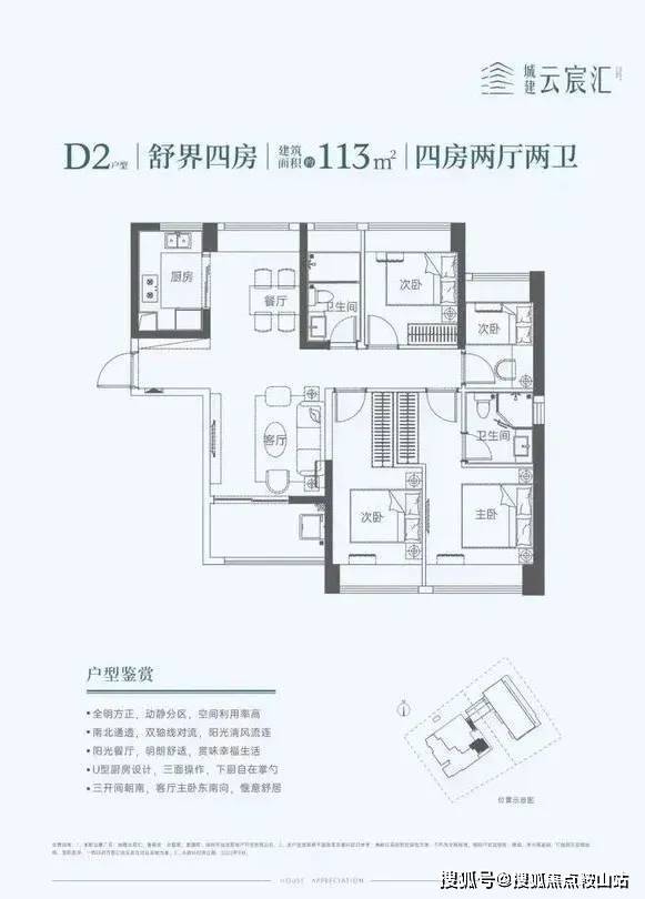 113㎡的4房2厅2卫,设计的竖厅南北通透格局,餐客厅一体化,U型厨房,阳台东南朝向。