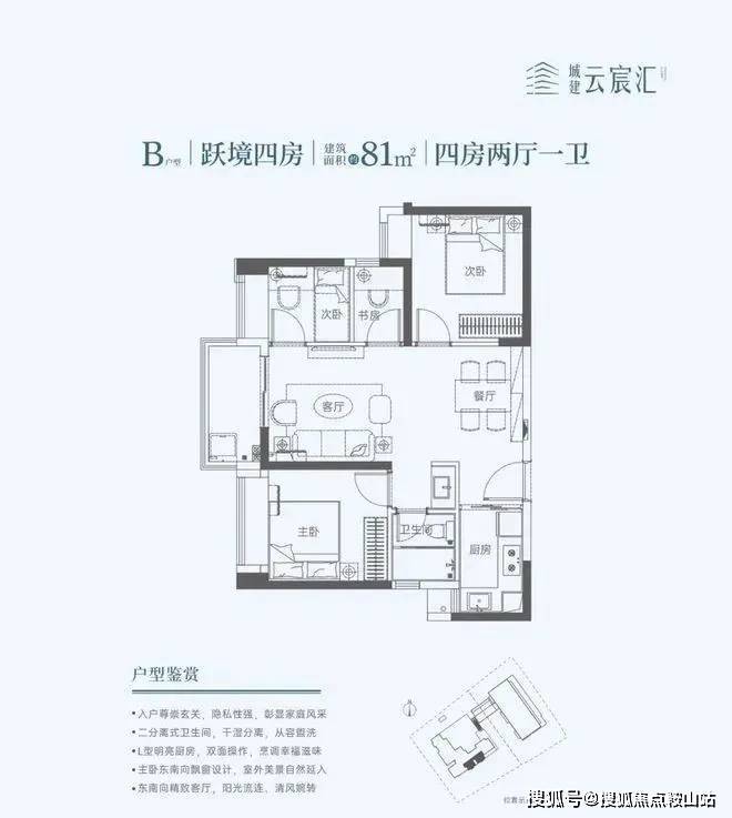 81㎡的4房2厅1卫,设计的双龙抱珠格局,餐客厅一体化,L型厨房,东南朝向,这个面积段能做到4房现在的市面上非常难得。