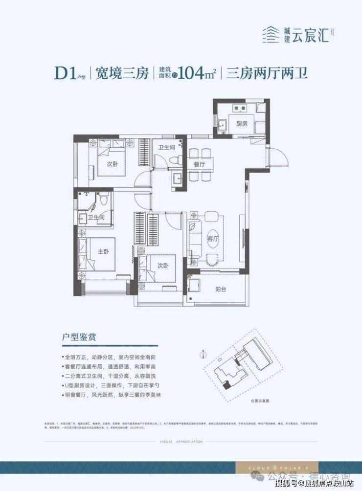104㎡的3房2厅2卫,设计的竖厅南北通透格局,餐客厅一体化,U型厨房,阳台西南朝向。