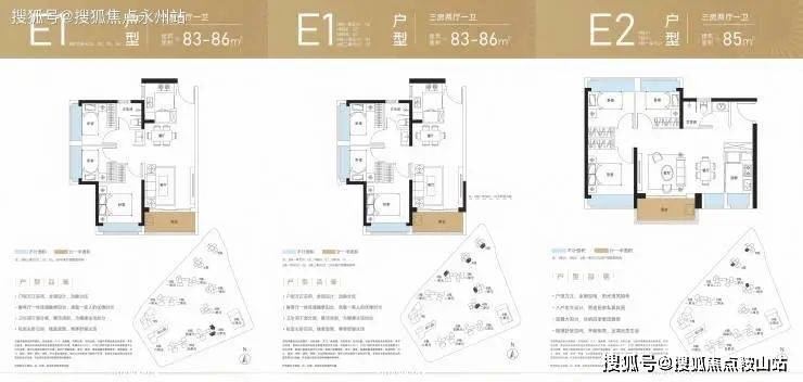 E1户型(83㎡竖厅):3.5米开间客厅,三段式卫生间设计,主卧带飘窗。