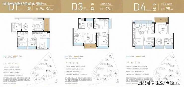 D3户型(95㎡):三开间朝南,“双龙抱珠”格局,阳台主朝东南/西南。