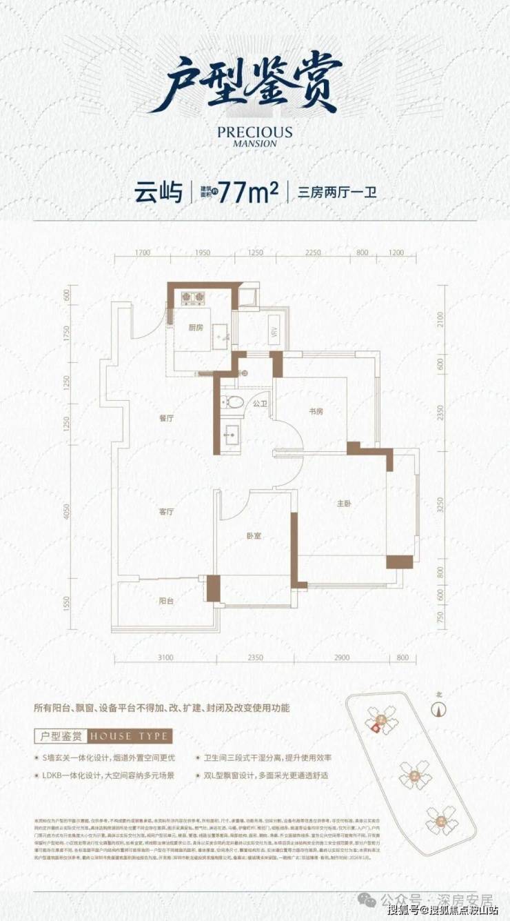 78㎡-3房2厅1卫,设计的是经典竖厅格局,客厅3.1米开间,LDKB一体化,S墙设计预留冰箱卡槽位,动静分区,三开间朝南,分别做到了主卧15.1㎡/次卧8.99㎡/次卧8.34㎡(包含墙体飘窗),U型厨房烟道外置,卫生间三段式分离,还带1个设备平台,得房率约100%(包含赠送),阳台约4.8㎡西南朝向。
