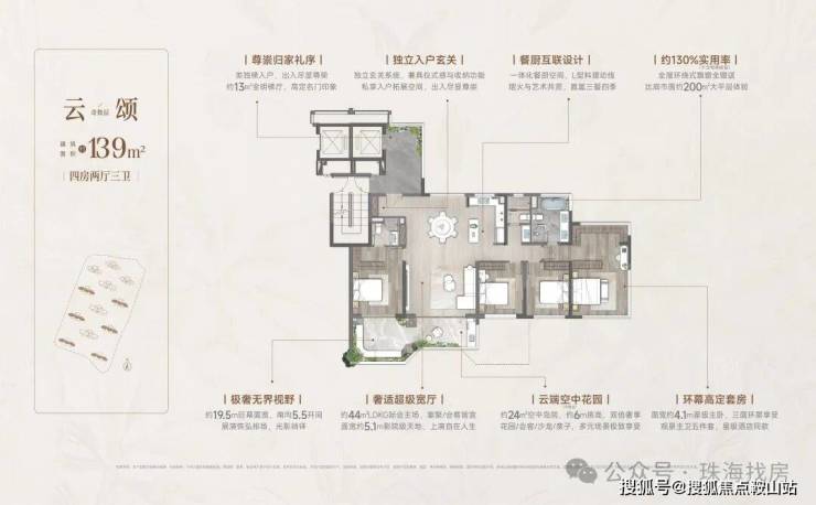 四代洋房·奢享写意人生 | 双入户大堂、一梯一户,稀缺至高约130%实用率(不含电梯厅),6面朝南,270°环幕采光,定制约6m错层空中浮岛,奢享墅质生活