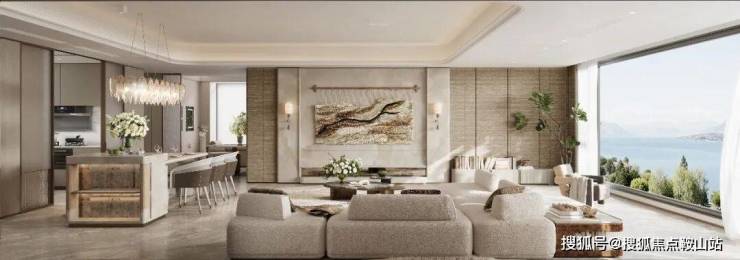 约 60.3㎡客餐厅 堪称豪宅核心气场,最重要的是,他 创新性做了 270°转角厅设计 ,直接释放 出 更长的采光面与观景面,足以媲美 200㎡户型。
