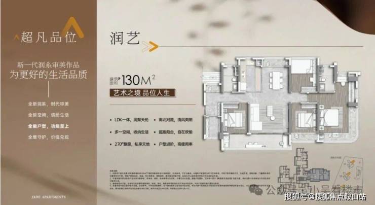 建面130平四房两卫,入户即见对景式玄关,可做景观装饰,也可做玄关柜收纳,该户型LDKB一体化设计,客厅开间超4米,可打通客厅旁的次卧做成7.2米大方厅,主卧配270度全景舱,可双面屏观景,总价650万起。
