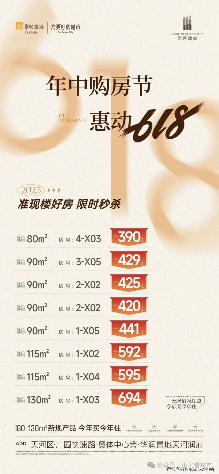 天河润府目前在售北地块1-2-4号楼的尾货,建面约81-130㎡户型,其中90平为东南向和西南向,115平也有东南和西南130平则是东南向,户型图如下: