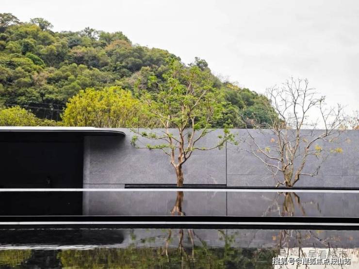 润府园林,有种穿梭在岭南山水之间的感觉,树种和落客区相呼应,听说以后都会移植到小区内部,水景地面的黑金沙石材,让水面显得格外清澈,能清楚看见倒映的树、山和天空。
