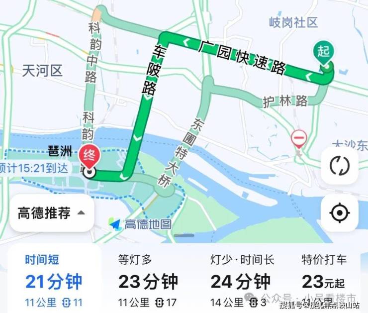 自驾去往琶洲:出小区上岐山路,转到广园快速路至车陂路,再转新港东路,全程11公里,耗时21分钟左右。