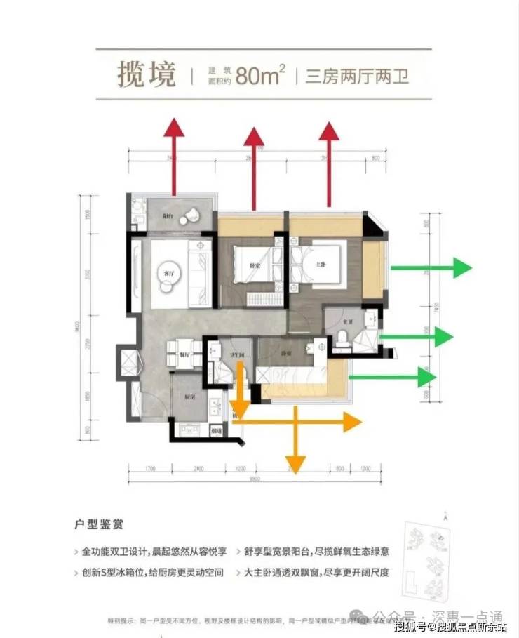 黄色箭头呢也是这里最需要注意的一点小次卧飘窗,客厅卫生间对出去是80平米的墙体还好不会对视就是遮挡问题,就是客厅飘窗有点尴尬对出去是80平米的两个卫生间