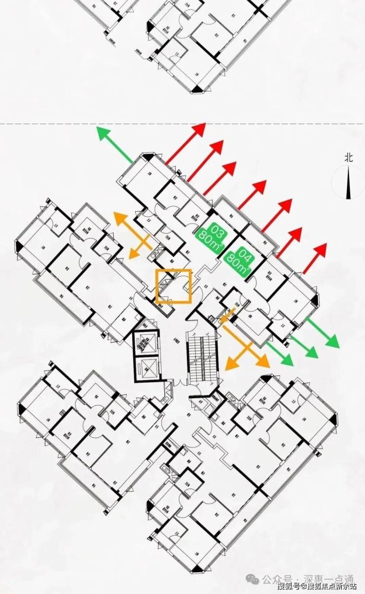 最后再来说一下黄色箭头情况这里是比较需要注意的点这里可以看一下这个楼栋平面图,其中书房次飘窗,客厅卫生间看出去是天井墙体,所以书房做了是双面采光这里还好,卫生间可能影响一点,客厅飘窗也会有跟06户型88平米的书房对视遮挡问题,这里后续可以通过其他问题解决
