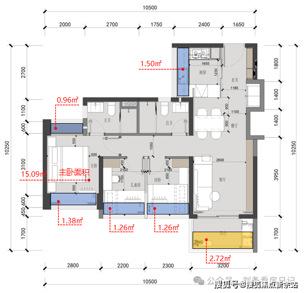 建面约88㎡户型,额外可使用面积合计约13.04㎡:飘窗部分额外可使用面积约10.32㎡,阳台部分额外可使用面积约2.72㎡