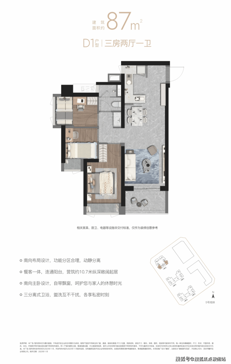 “10.7 m纵深紧凑南向三房”,10.7 m纵深餐客一体,通风采光极佳