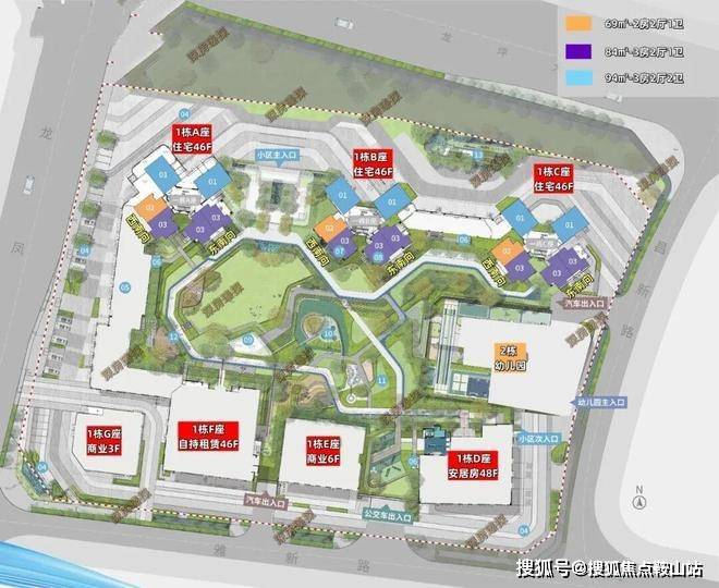 项目由6栋高层住宅围合式组成,总户数1592户,其中可售商品房约750套,安居房373套。1A(46层)、1B(46层)、1C(47层)为可售住宅,1D为安居房,1E为商寓,1F为自持物业。