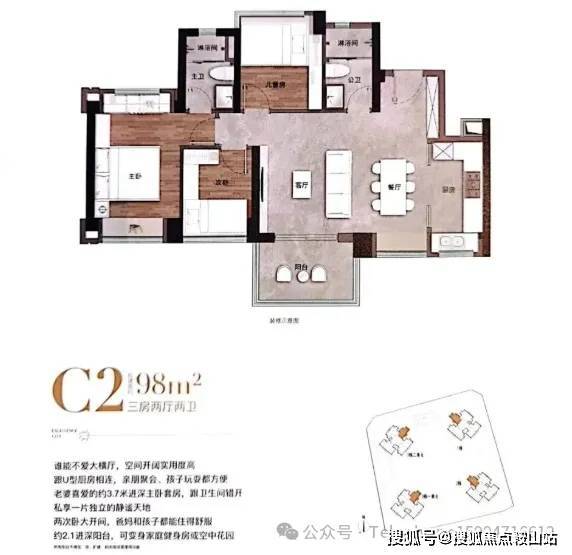 98平方米的3房2厅2卫户型,设计为横厅格局,南北通透,L型厨房,主卧双飘窗通透设计。