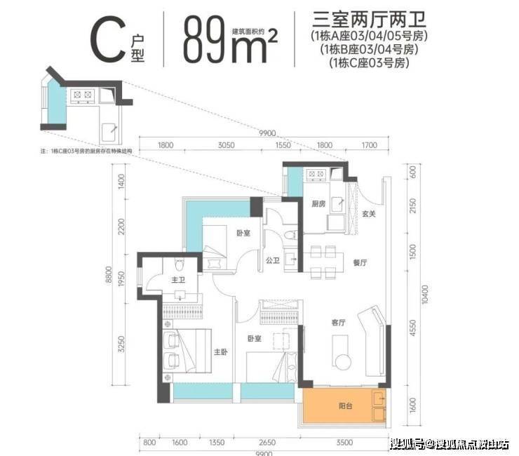 C户型-89㎡的3房2卫,设计的经典竖厅格局,客厅3.5米开间,餐客厅一体化,三开间朝南,三分离卫生间,有西南及东南朝向。