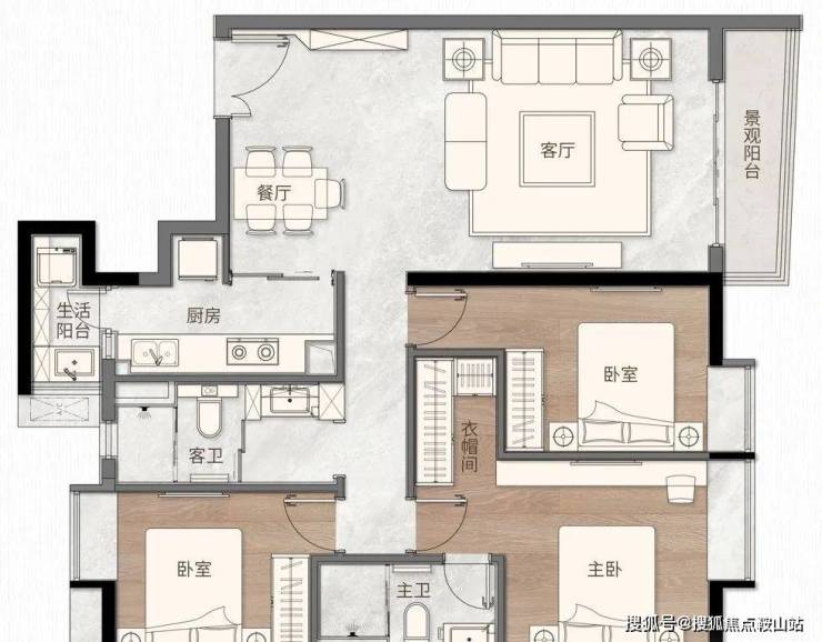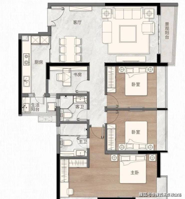 建面117平三房,这个户型阳台飘台都比较大,视野比较广,客卫三分离设计,主客分明。
