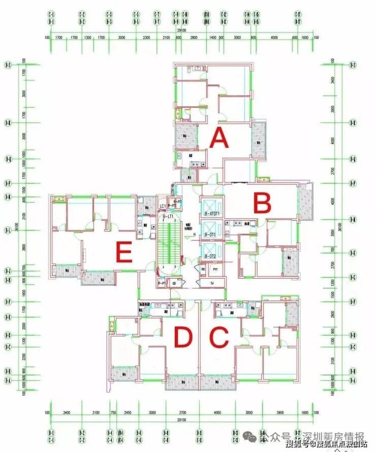 项目三栋住宅均为塔楼设计,A座三梯四户,B座、C座均为三梯五户,各栋户型分布平面图如下: