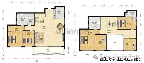以上两个户型格局基本大同小异,东南和西南朝向,南北通透,均为客厅出阳台,卫生间干湿分离,餐厅可外拓出去改5房。