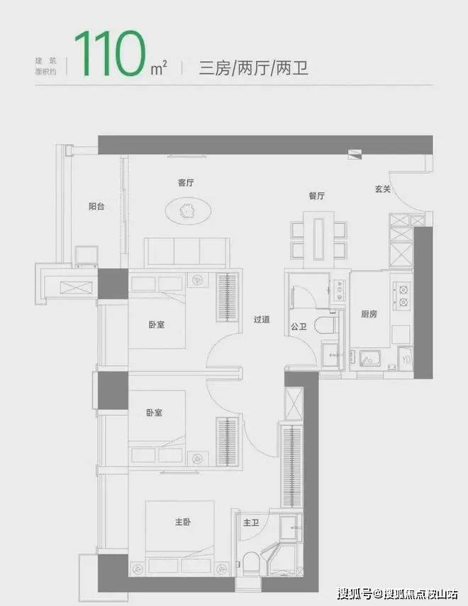 110㎡三房:经典竖厅设计,动静分明,保障隐私。卧室标配飘窗,观景阳台展开风景画卷。餐客一体化设计,连通阳台,畅享全家欢聚时刻。主卧私享化设计,配备独立卫浴和衣帽间,为居民提供私密、舒适的居住体验。