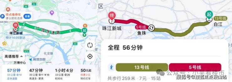 从项目去珠江新城,自驾走广园快速大概33公里,需要1小时左右,坐地铁的话,如果从家门口坐大巴到白江地铁口,乘坐13号线到鱼珠转5号线,再到珠江新城大概需要56分左右{加上大巴时间,全程大概70分钟左右,如果是去金融城、科学城、老黄坡等地上班的话,通勤时间会更短。