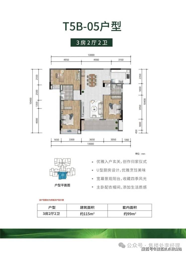 :3 房 2 厅 2 卫,建筑面积约 115m²,套内面积约 99m²。优雅入户玄关,U 型厨房设计,宽幕景观阳台,主卧还配有衣帽间,提升生活质感。