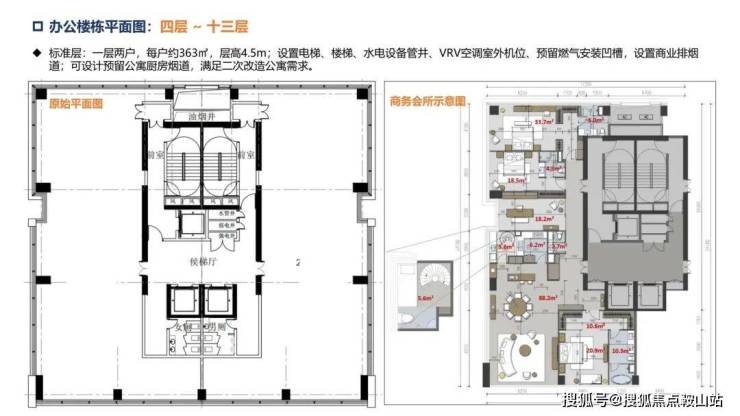 办公楼:层高约4.5米,两梯两户,单套270°三面采光环幕山海城港景观,14楼顶层复式,电梯可上15层。