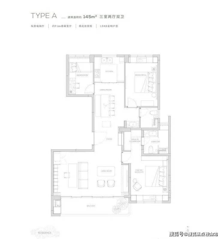 145产品为三房两厅两卫产品,餐厨一体化设计, 7米宽厅可切换各种生活场景,畅享宽幕般景观界面。