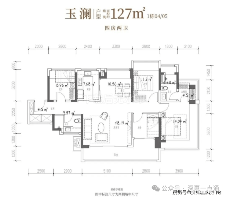 127㎡的4房2厅2卫,设计的是竖厅南北通透格局,进门独立玄关,客厅5.1米开间,客餐厅分离化设计,主卧270°无柱转角飘窗+衣帽间,分别做到了主卧18.55㎡/次卧11.2㎡/次卧8.96㎡/次卧7.84㎡(包含墙体飘窗),U型厨房烟道外置,卫生间干湿分离,得房率约98.97%(包含赠送),客厅连接次卧出超大阳台约14.09平,西南或东南朝向。