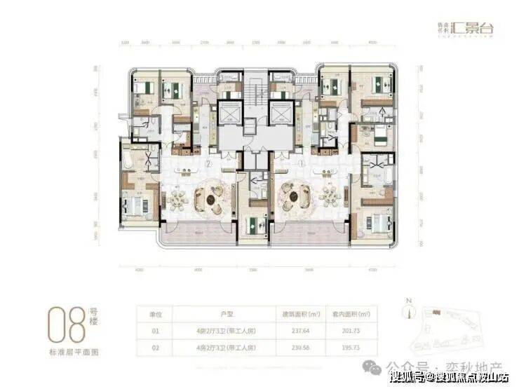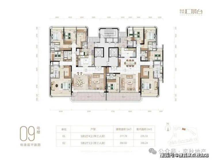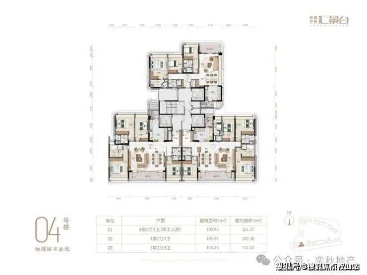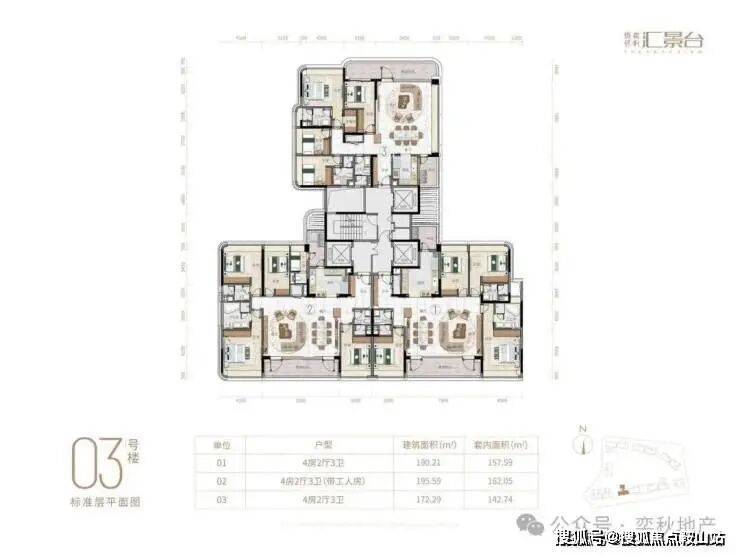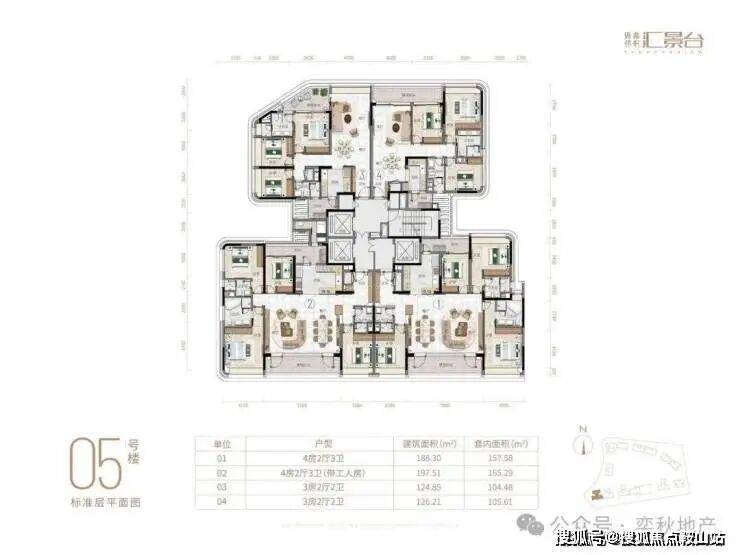 项目由14栋12层小高层组成,产品涵盖123-352㎡三至五房,共8类户型,户型实用率约82-84%
