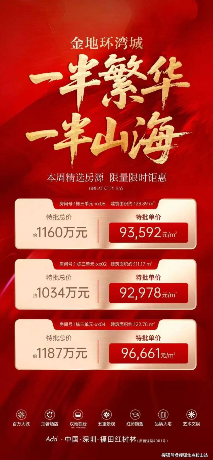金地环湾城位于福田核心地段,一站香蜜湖一站河套。作为福田中心区百万大城,由福田投控与金地集团联袂打造,聚合塔尖住宅、高端公寓、红岭红树林小区、嘉佩乐隐奢酒店、商务地标、公园绿地、漫调商业、文化艺术等八大业态于一体。项目主推建面约121-253-270㎡海景阔宅,165-240㎡雅奢大宅。