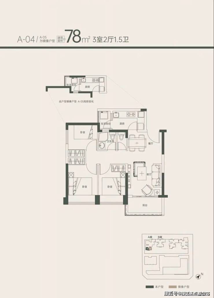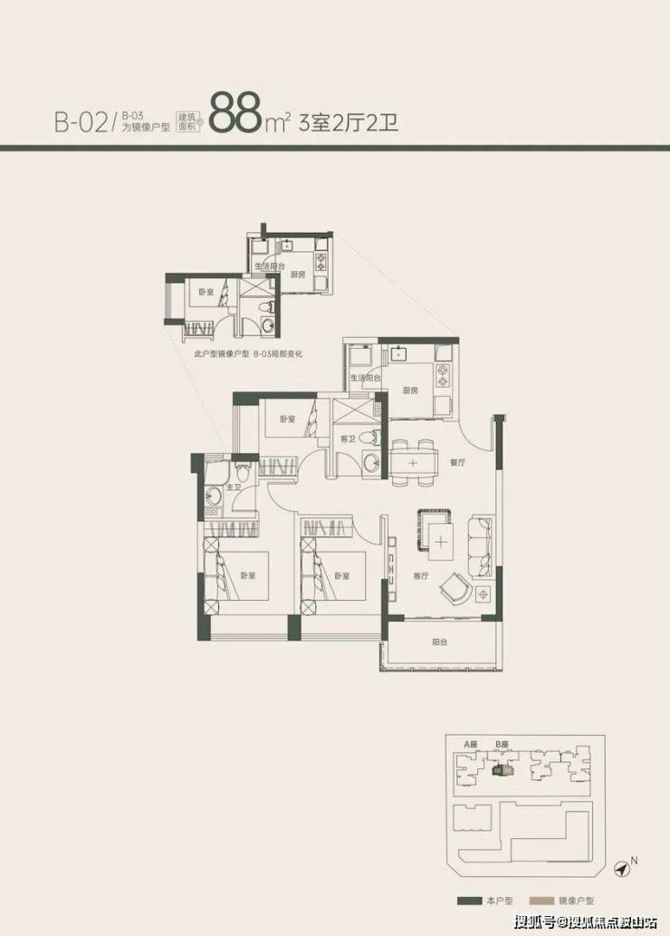 3、88㎡ 3房 单价7.48万/㎡起 总价659万起 (5楼2套)