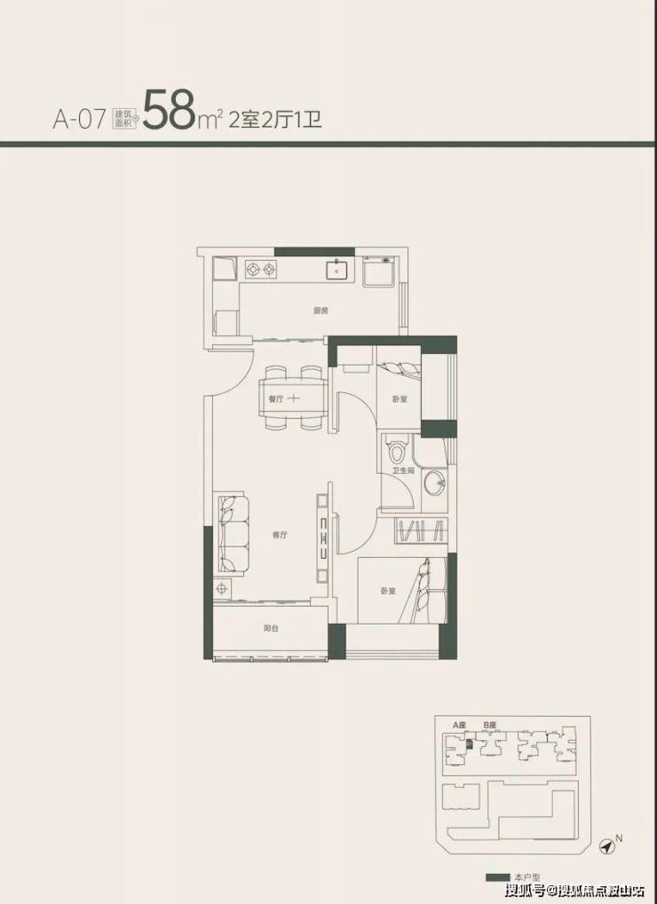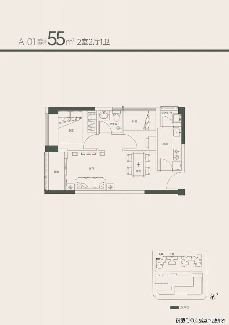 1、55㎡ 2房 单价6.8万/㎡起 总价373万起 (5楼4套)