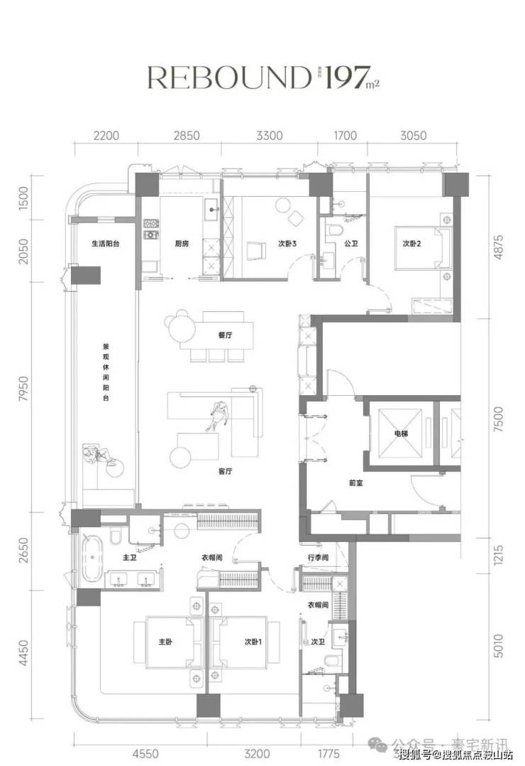 •尺度革新:建面约197m²户型,专梯入户设计。户型格局极致方正,动静分区清晰,实现了三面采光与双南向套房的“双龙抱珠”格局。