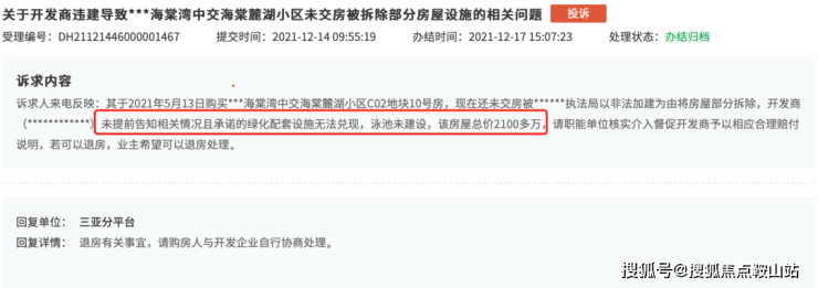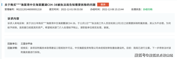 翻看领导留言板,发现两个投诉很有意思,21年5月买房的业主,12月被通知拆除。投诉无果~