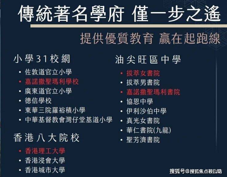 校网方面:小学属31校网,中学属于油尖旺区。31校网有佐敦道官立小学、嘉诺撒圣玛利学校、广东道官立小学、德信学校、东华三院罗裕积小学、中华基督教会湾仔堂基道小学。中学有拔萃女书院、拔萃男书院、嘉诺撒圣玛利书院、协恩中学、伊利沙伯中学、真光女书院华仁书院(九龙)、圣芳济书院,其中拔萃女书院离项目百米之内。大学方面有香港理工大学、香港浸会大学、香港城市大学。