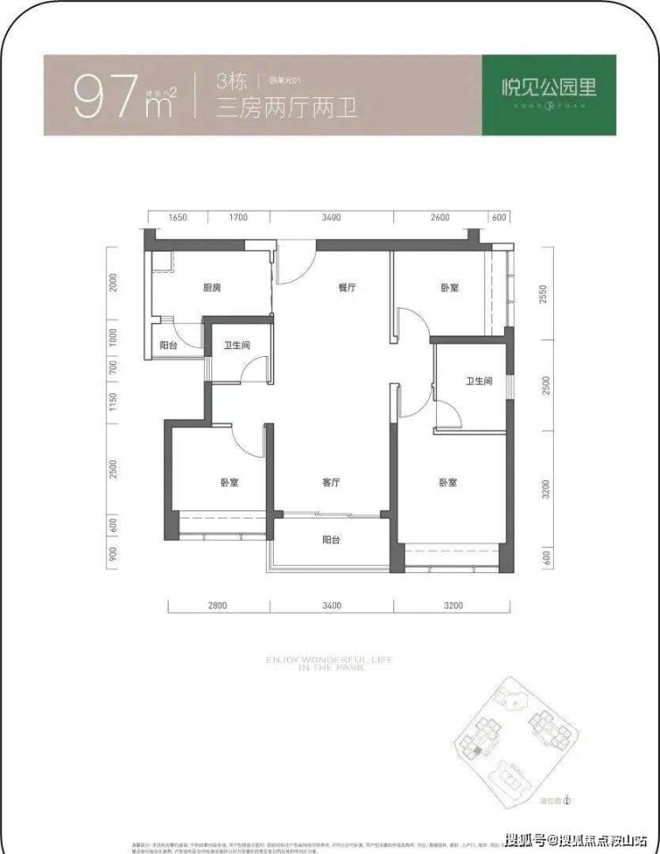 97㎡的3房2厅2卫,仅3栋4单元01户型,设计的是竖厅双龙抱珠格局,客厅3.4米开间,三开间朝南,3个卧室分别做到了3.2米/2.8米/255米的宽度,L型厨房带1个生活阳台,公卫三段式分离,得房率73.61%(不含赠送),东南朝向。