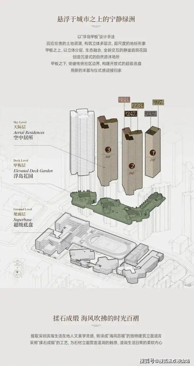 这次「后海招商玺」住宅设计采用“浮岛甲板”设计策略,四栋住宅落于甲板之上,独享甲板庭院花园。进而形成超级社区底盘 + 浮岛绿化甲板的垂直共生人居标杆。