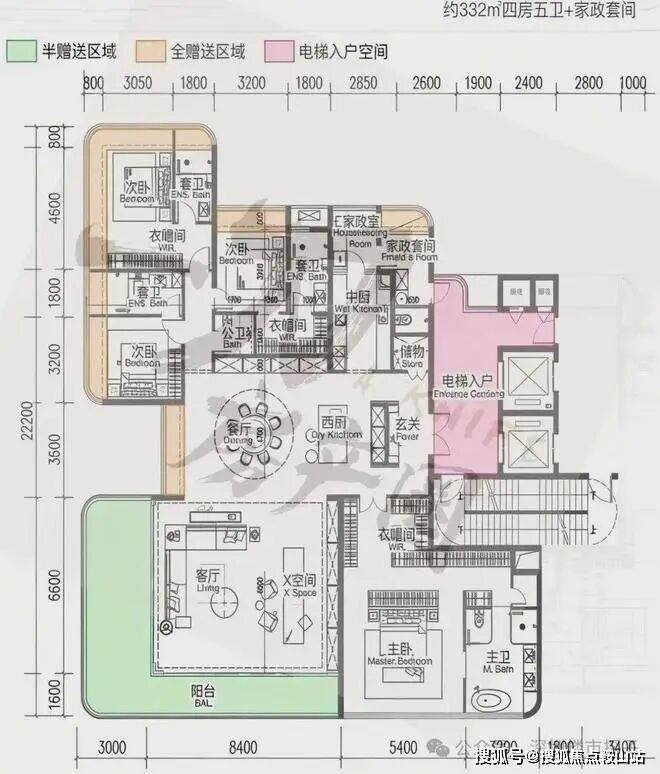 330㎡4+1房五卫+家政套间,2梯2户,总价约5000万(15.2万/㎡)。