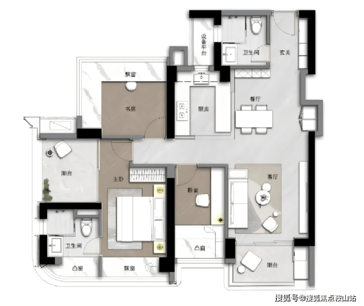 竖厅动静分区,玄关处有个公卫,距离两个次卧较远,主卧套房设计,旁边的阳台可以改做卧室。